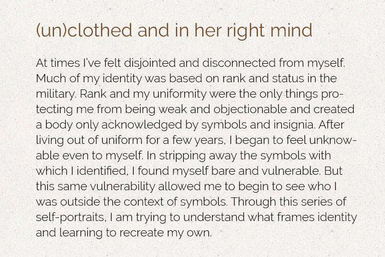 The artificial light blinds me for a moment. I sit on the stool in the center of the bay in what has become a make-shift photo studio—the only installation in the room. Hot lights above, the American flag and the Marine Corps flag criss-crossed behind me. Guttural vulgarities echo through the empty bay as drill instructors fuss with the other women in line. My drill instructor velcros a sham around my neck. It’s an intricate, yet deceptively simple design but she still yanks and tugs at the cloth until she is satisfied. She adjusts my posture with a heavy hand. The collar is fastened tightly at the nape of my neck and the cloth lays flat over my shoulders and chest. The back is uncovered held together with some old clothes-pins. The edges of the cloth are frayed and uneven - a sloppy cut-out of what was once a proud uniform. Blue-black cloth with scarlet piping; pointed collars folded out to a v-neck over a mock, white dress shirt. The gold emblems on the collar and shoulder lapels remind us that one day we will be Marines. But not today. There are four weeks left of boot camp. I adjust a bucket-shaped hat ridiculously on the top of my head and the photographer snaps the picture. “You’re done. Now get out of my face.” I’m yanked from the seat and the drill instructor moves on to the next recruit in line.
